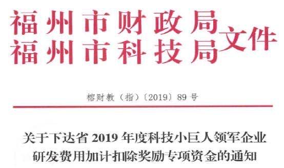 為鼓勵(lì)企業(yè)加大研發(fā)經(jīng)費(fèi)投入,政府對(duì)企業(yè)研發(fā)投入給予多項(xiàng)稅收優(yōu)惠補(bǔ)貼政策,我司積極響應(yīng)政府號(hào)召,加大技術(shù)研發(fā)力度,繼2017年取得“福建省科技小巨人領(lǐng)軍”企業(yè)稱(chēng)號(hào)后,連續(xù)三年獲得科技小巨人領(lǐng)軍企業(yè)研發(fā)費(fèi)用加計(jì)扣除獎(jiǎng)勵(lì), 2019年度獲得77.1萬(wàn)元獎(jiǎng)勵(lì),累計(jì)獲得該項(xiàng)專(zhuān)項(xiàng)獎(jiǎng)勵(lì)金187.1萬(wàn)元。