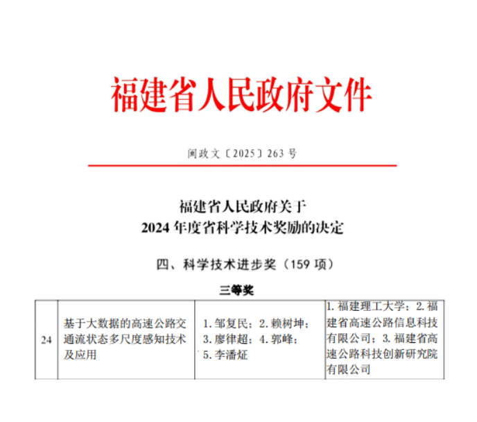 近日,福建省人民政府印發(fā)《關于2024年度省科學技術獎勵的決定》,公司聯(lián)合高校、科創(chuàng)院重點攻關的“基于大數(shù)據(jù)的高速公路交通流狀態(tài)多尺度感知技術及應用”項目,憑借其前瞻性的技術創(chuàng)新和顯著的應用成效,榮獲福建省科學技術進步獎三等獎。該獎項是對公司在智慧交通領域持續(xù)深耕、勇于創(chuàng)新的高度肯定。