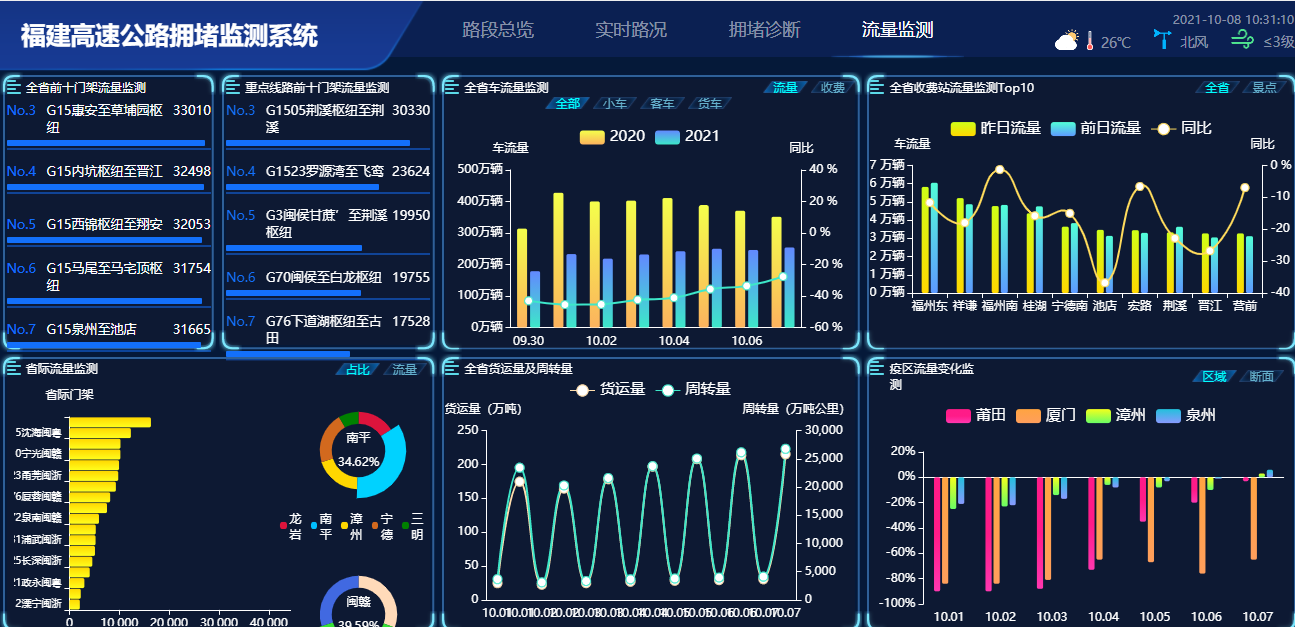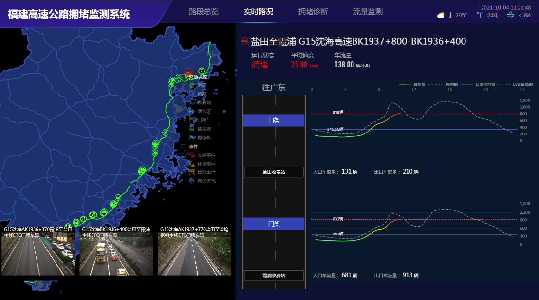 高速公路擁堵預(yù)警分析系統(tǒng)實(shí)現(xiàn)“一張網(wǎng)、一屏清”,具有以下特色:一是實(shí)現(xiàn)基于ETC門架數(shù)據(jù)易擁堵路段交通狀態(tài)評(píng)估分析。系統(tǒng)實(shí)時(shí)分析計(jì)算區(qū)間交通量、平均速度,并結(jié)合易擁堵路段歷史擁堵事件特性,建立擁堵評(píng)價(jià)指標(biāo),實(shí)現(xiàn)運(yùn)行狀態(tài)評(píng)估分析;二是實(shí)現(xiàn)多分辨率視頻AI智能分析。通過接入天龍山、崗山隧道視頻圖像,融合視頻AI分析技術(shù),實(shí)現(xiàn)對(duì)隧道內(nèi)車輛違停、交通擁堵等事件的及時(shí)識(shí)別,并可適應(yīng)全省隧道高清、標(biāo)清視頻圖像分辨率;三是實(shí)現(xiàn)路況局部精細(xì)化可視化展現(xiàn)。實(shí)現(xiàn)擁堵路段局部精細(xì)化展示,疊加收費(fèi)站、隧道、服務(wù)區(qū)等構(gòu)造物信息,實(shí)時(shí)輪巡區(qū)間內(nèi)視頻圖像,并對(duì)路段前后收費(fèi)站ETC門架交通流量進(jìn)行實(shí)時(shí)監(jiān)測(cè);四是實(shí)現(xiàn)路網(wǎng)交通流參數(shù)高精準(zhǔn)預(yù)測(cè)。利用卷積神經(jīng)網(wǎng)絡(luò)機(jī)器學(xué)習(xí)算法,通過歷史海量大數(shù)據(jù)的訓(xùn)練學(xué)習(xí),實(shí)現(xiàn)對(duì)區(qū)間流量、平均車速等指標(biāo)的較高精度預(yù)測(cè)。